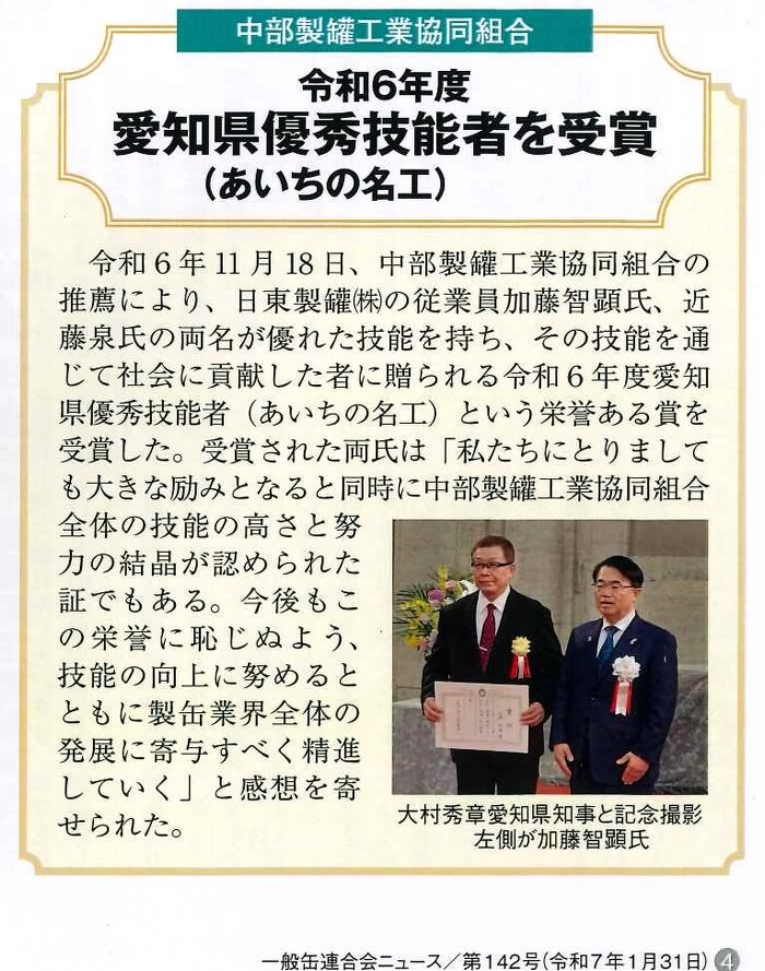 一般缶連合会ニュースに掲載させていただきました 2025年02月06日 令和6年度愛知県優秀技能者「あいちの名工」に弊社従業員 加藤智顕 近藤泉 の2名が選ばれたことが一般缶連合会ニュース第142号にて掲載されました。 令和6年度愛知県優秀技能者... 一覧へ
